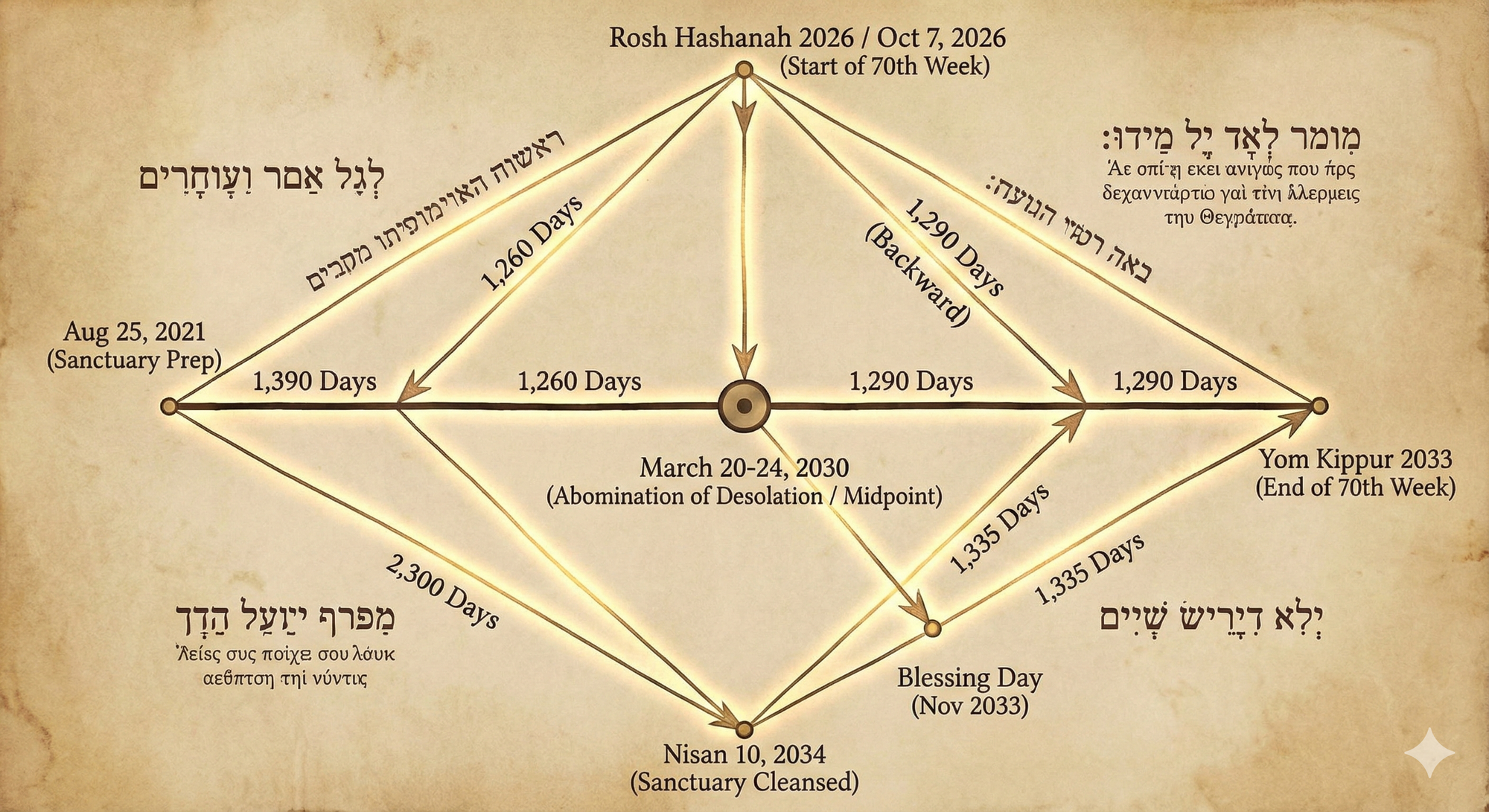 The diamond chiasm that we've mapped takes its name from the shape that emerges when you plot the day-counts: two 1,260-day halves flanking the abomination pivot (March 20-24, 2030), with the 1,290 and 1,335 extensions creating asymmetric "points" that reach to Yom Kippur and the mysterious blessing day respectively. The 2,300-day sanctuary count then overlays as a longer arc from 25th August 2021 to December 12, 2027 and then finally to 10 Nisan 2034—creating a diamond-within-diamond structure where the temple timeline nests inside the broader 70th Week.